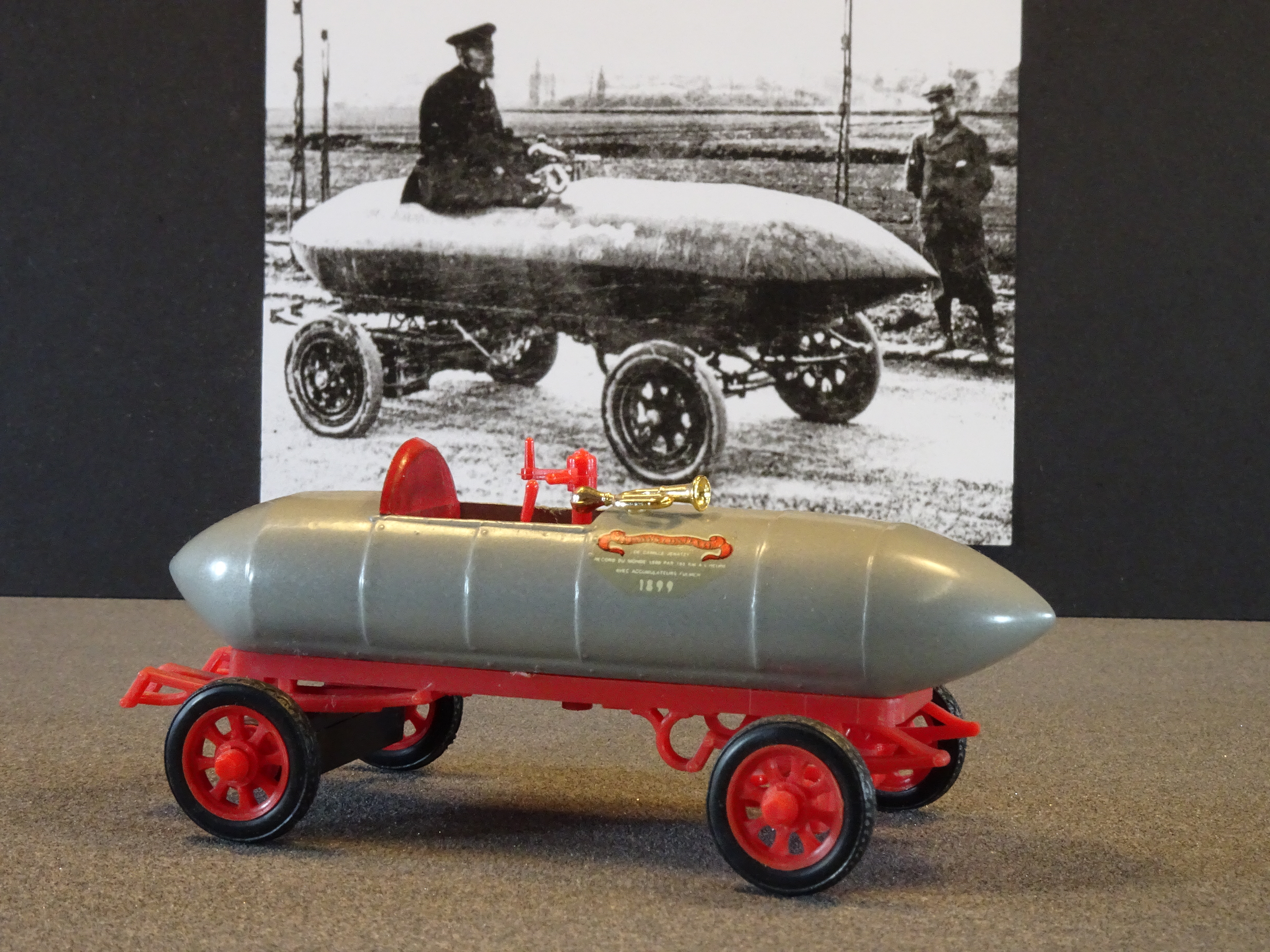 1899 La Jamais Contente driven by Camille Jenatzy to a speed of 65.79mph. Model by Rio